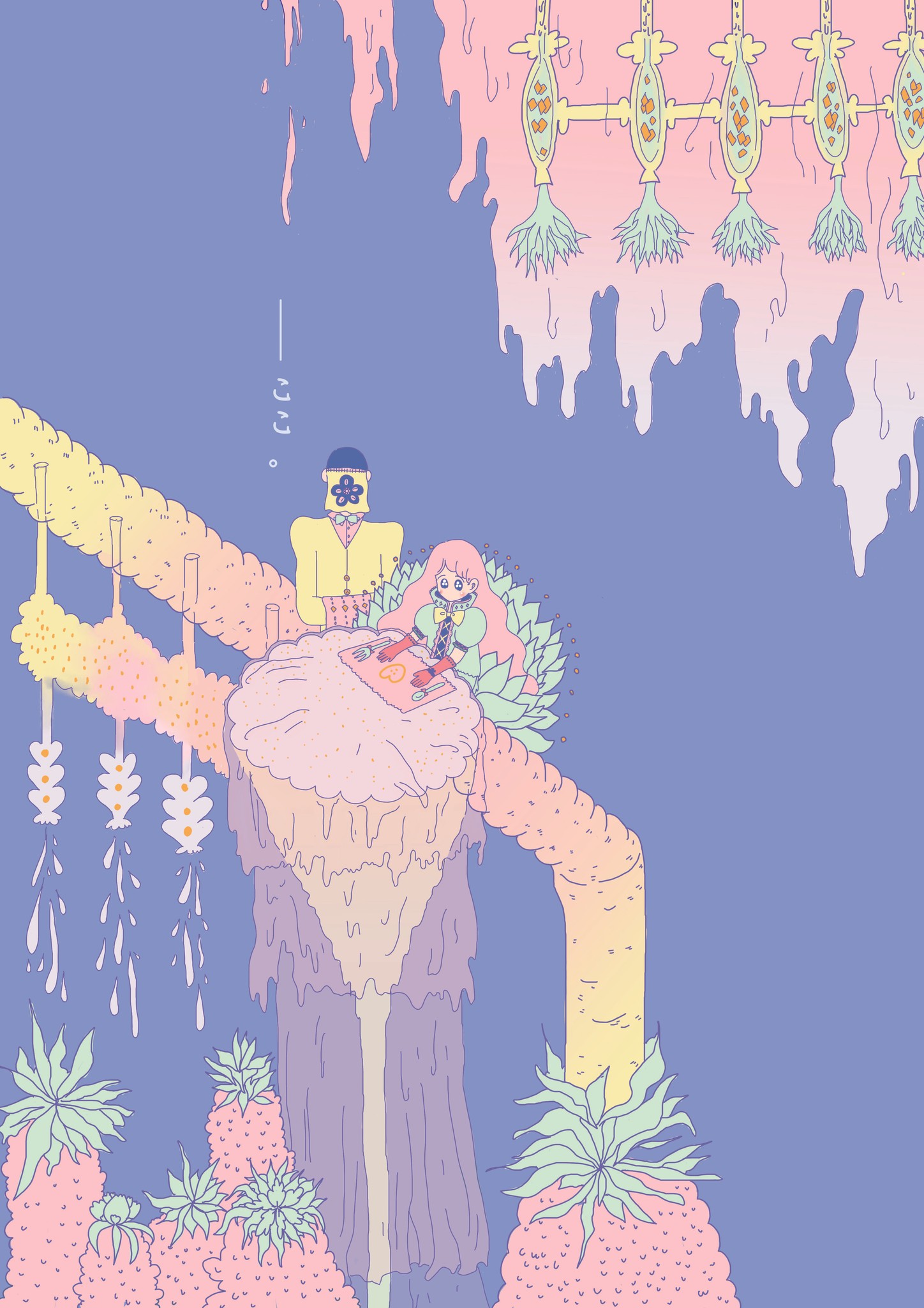 充滿甜蜜糖果與鬆軟雲朵的世界總是令人垂涎嚮往,人們總是漂浮在夢與現實的交界處,不可自拔。以夢幻的構圖和柔和的色彩,帶領觀者進入充滿夢想的世界。漫步其中,彷彿置身在甜蜜的童話夢境裡,卻也暗藏著各種來自現實的幻想及短暫的美好。